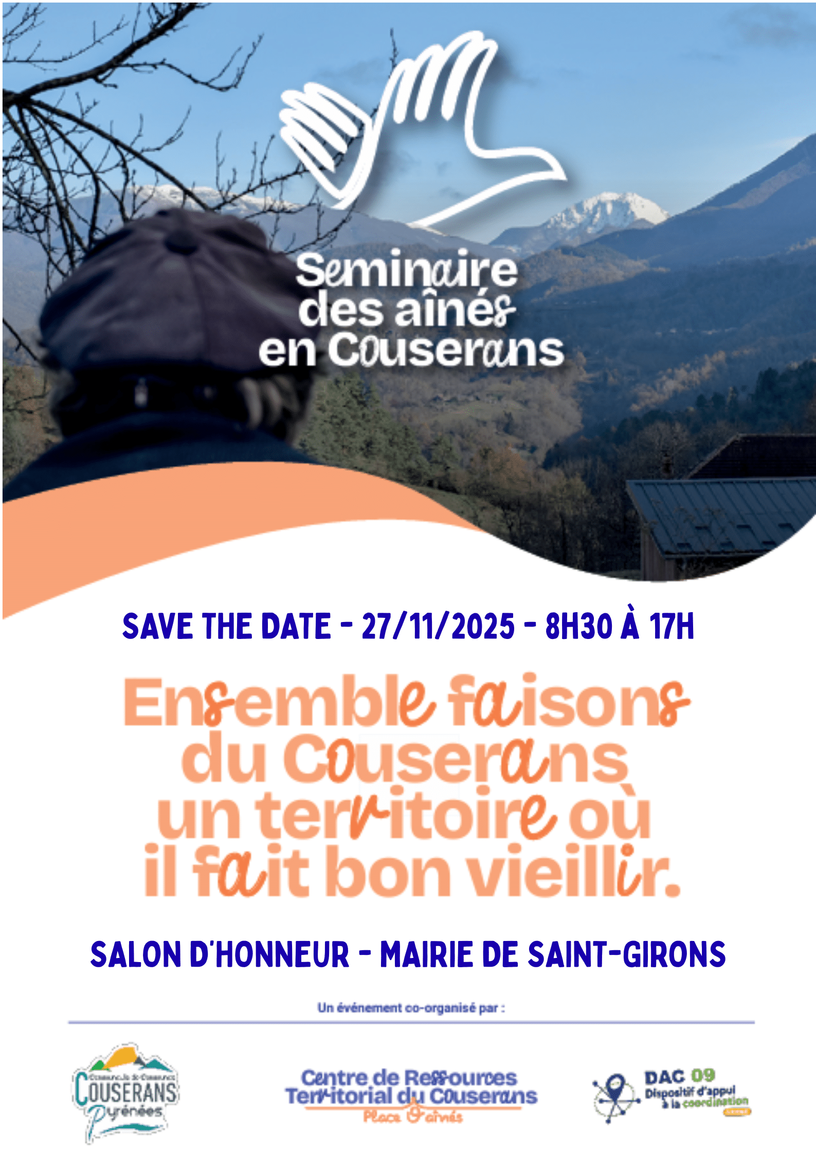 Le Séminaire des aînés du Couserans se tiendra jeudi 27 novembre 2025 au salon d'honneur de la Mairie de Saint-Girons, à l’initiative conjointe du CRT du Couserans, du Dispositif d’Appui à la Coordination Ariège (DAC 09) et de la Communauté de communes Couserans...